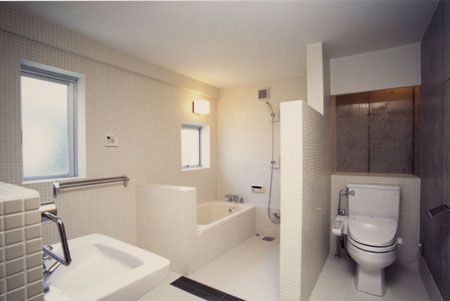 汚れが目立つ白タイルであえて統一したバス&トイレ。こまめに掃除する習慣が自然と身に付く。