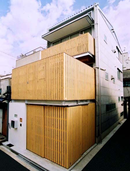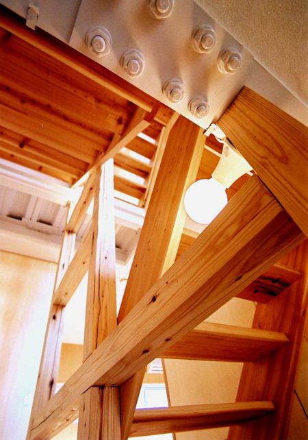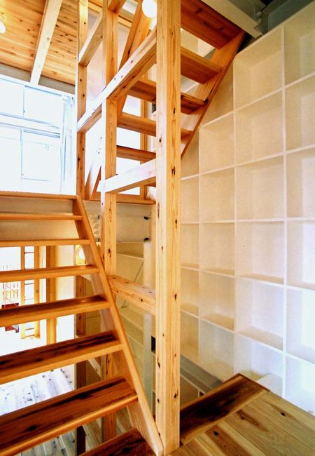 プライバシーを保護しつつ風通しと採光は十分である上、悩みのタネだった西陽を柔らげてくれる。南側に多数の窓を設け、北側は徹底した収納スペースとして利用した。ガラス作家として使うアトリエスペースと二世帯の居住スペースの確保という難題をクリアしたスキップフロア構成。建物登記官も首をかしげた「多分、3階建」という物件。