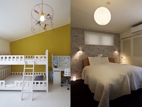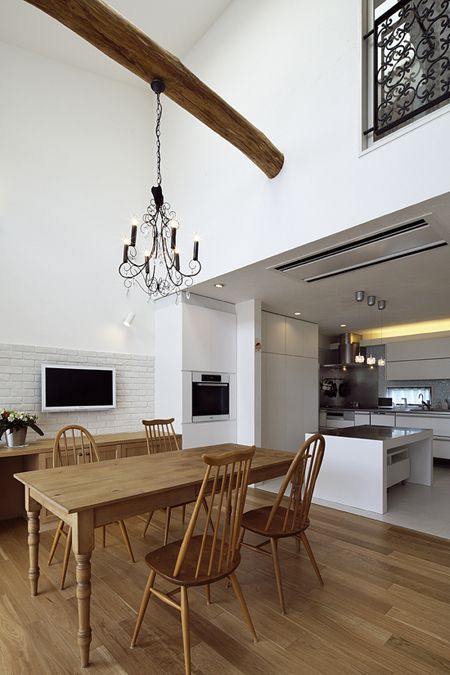 吹き抜けのあるダイニング。シャンデリアを吊すために、化粧丸太梁を設けました。少し色をつけて、アンテーク風にしています。