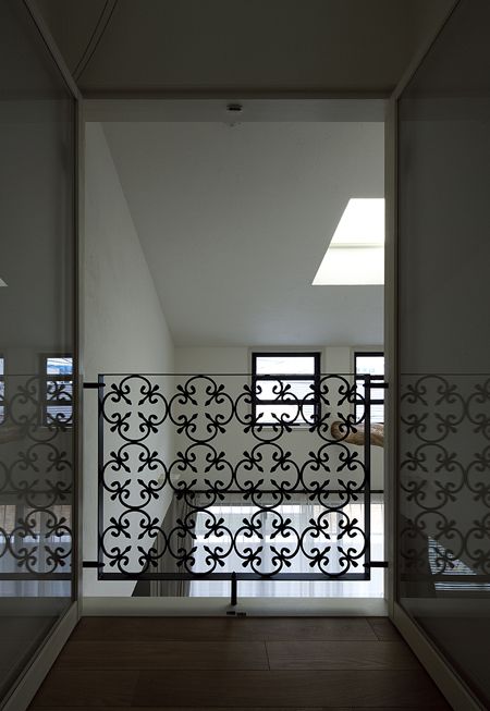 リビングを見下ろす、ちょっとした空間に、花柄の鋳物を組み合わせた手摺りをつけました。冬の寒いときは、ポリカボネートをはめた扉を閉めて、暖かい空気が逃げないように工夫をしています。