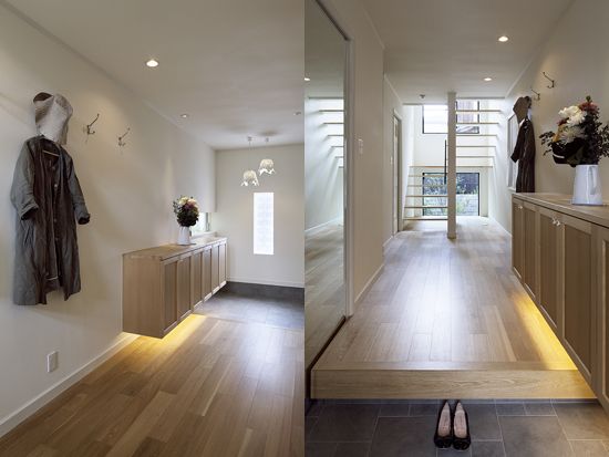 玄関へ至る廊下の壁にクライアントが見つけてこられたコートフックを取り付けました。廊下の巾をゆったり取ったので、コートを掛けてもじゃまになりません。庭からの柔らかい光が、廊下を包みます。